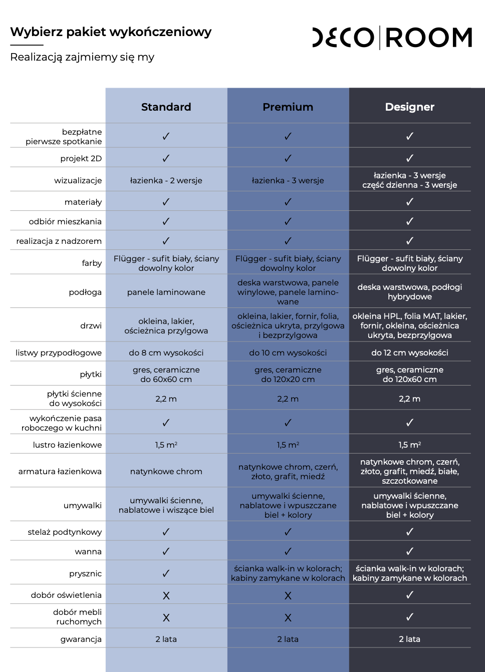 Oferujemy współpracę z pracownią architektoniczną Decoroom, którą rekomendujemy naszym klientom. Z ich profesjonalną pomocą możesz zaprojektować wnętrze, które nie tylko zachwyca estetyką, ale również cechuje się praktycznością i funkcjonalnością. Dzięki starannie dobranym, wysokiej klasy materiałom, Twoje mieszkanie przez długie lata będzie nie tylko piękny, ale także trwały i zgodny z ponadczasowymi trendami w dziedzinie designu. Ich bardzo ważną cechą jest kompleksowość. W jednym miejscu oferują projekt, materiały, sprawdzoną ekipę wykończeniową i gwarancję na wykonane usługi. Świadczą wysoką jakość usług i pełną współprace na wszystkich etapach realizacji projektu.